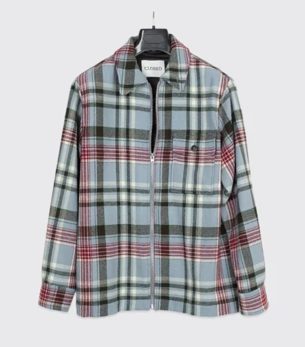 Men’s size S blue multi-color checked wool full-zip shirt with pockets