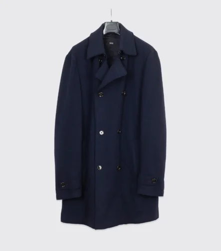 Hugo Boss Coat Size 46L Solid Dark Navy Blue Virgin Wool Blend Double Breasted