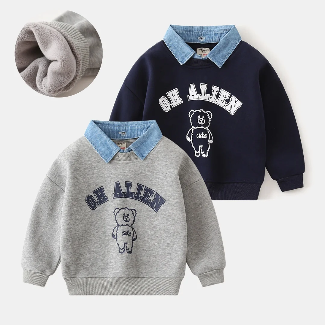 2025 New Style Kids Clothes Pullover Cotton Fake Two-Piece Sweatshirt 2-7Y Children Boys Girl Bear Print Casual Fleece Lined Top
