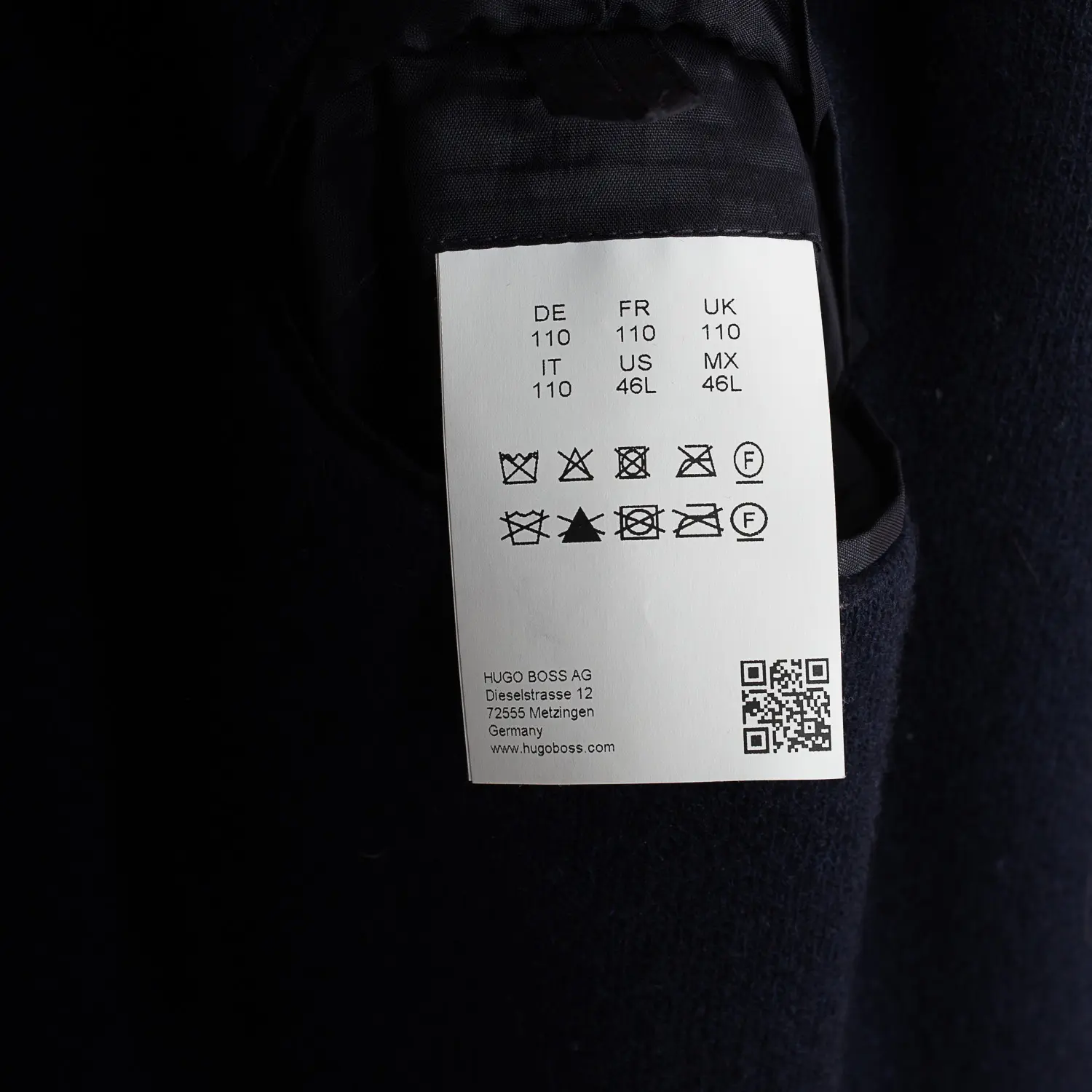 Size 46, marked size UK 110 / US 46L, measures 24.5 in chest (underarm to underarm), 29.25 in sleeve (from shoulder), 20.5 in shoulder width, 37 in length (bottom of collar to hem)