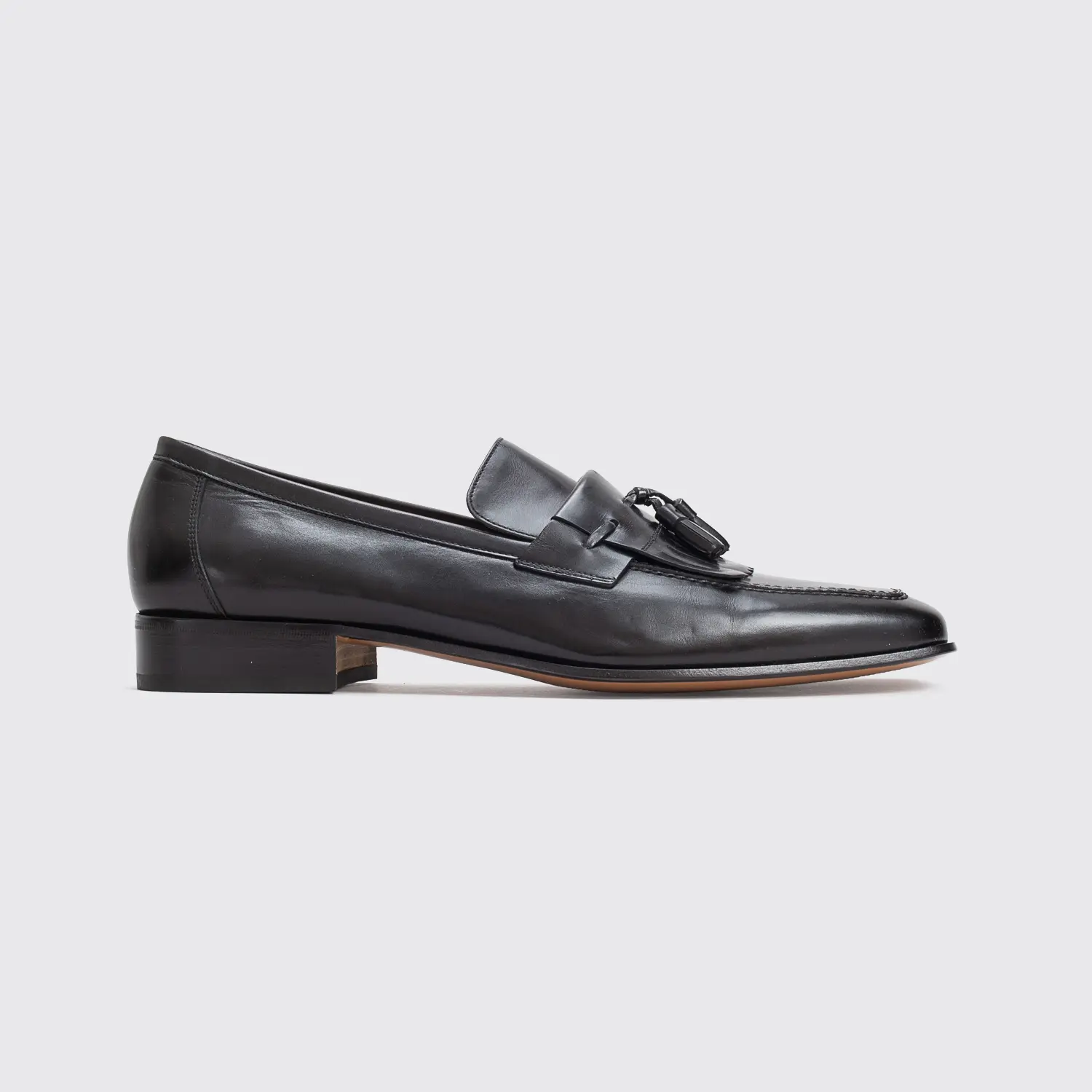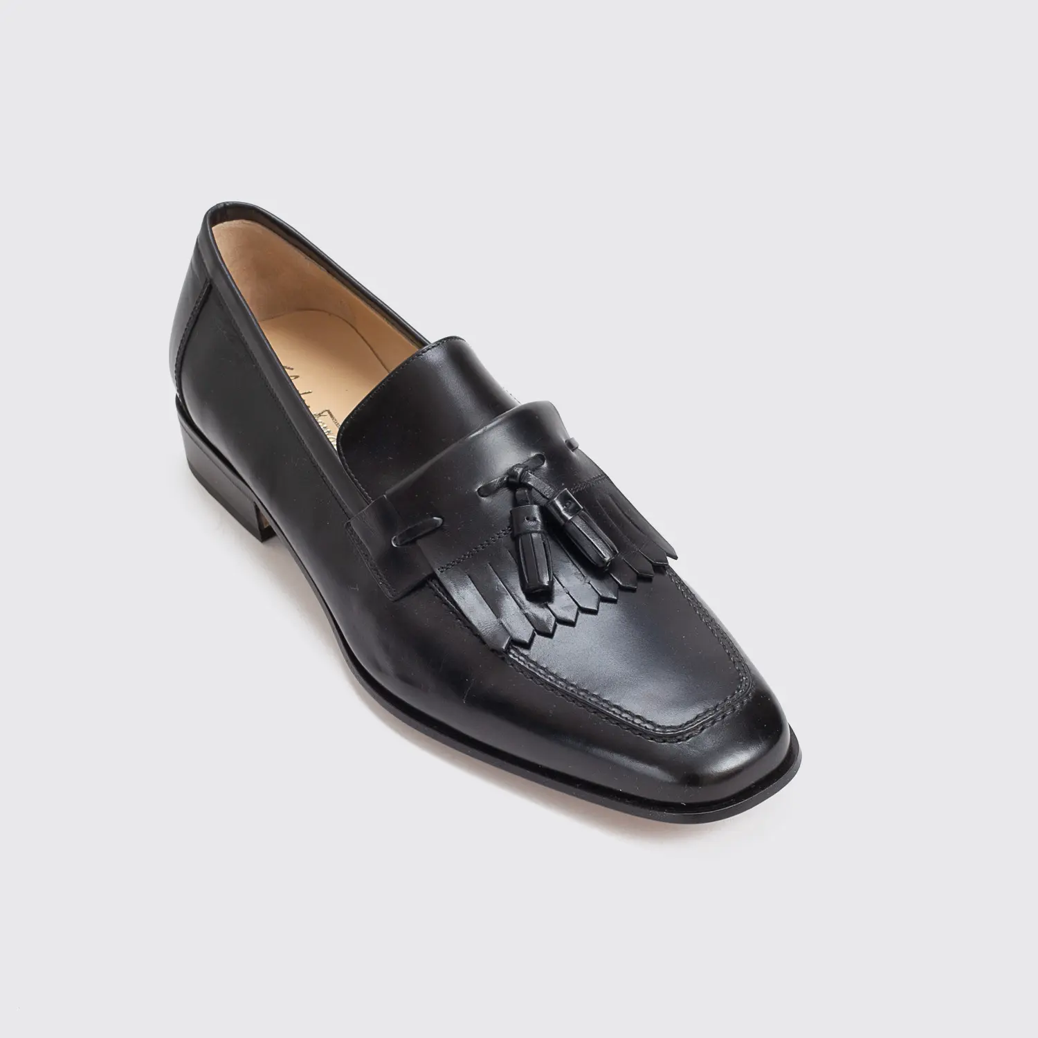 Mango Kilt Tassel Loafer in Black Calf, Slip On Closure, Square Toe, Leather Sole, Solid Pattern, Est. retail: $695.00
