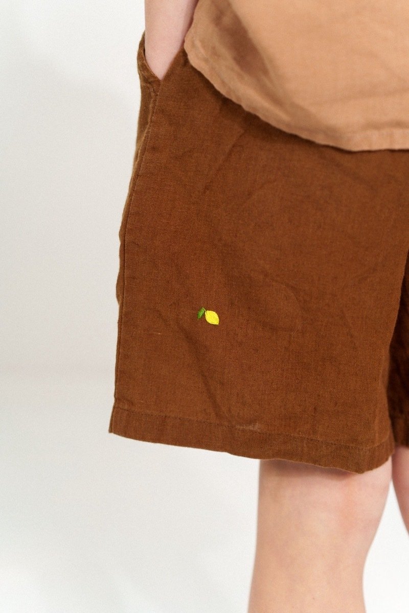Elastic waistband with tie fasteningTwo inseam pocketsWashed and soft medium weight organic linen (160 g/m²)Optional handmade embroidery